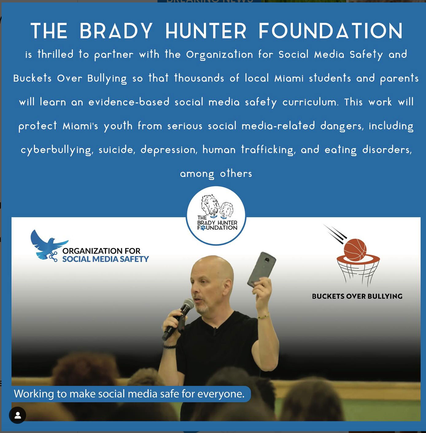 The Brady Hunter Foundation has partnered with OFSMS and Buckets Over Bullying to bring social media safety curriculum to Miami’s students and parents. The curriculum addresses cyberbullying, suicide, depression, and more. You can read about the Brady Hunter Foundation below.